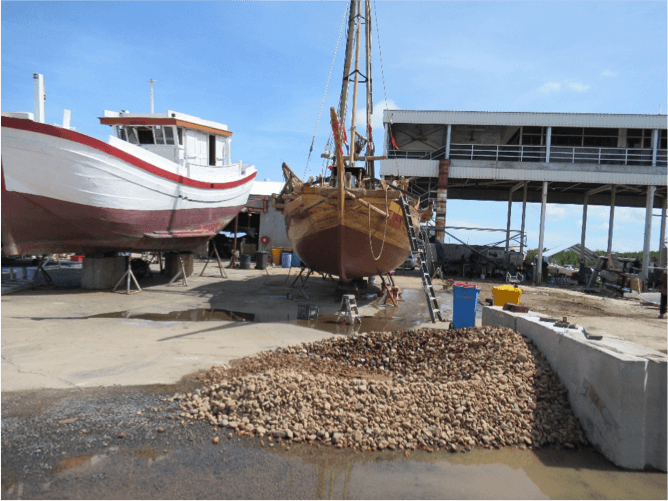 The Prau next to a Vietnamese fishing boat with the ballast at the front of the boat waiting to be reinstalled!