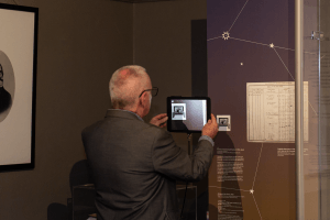 An augmented reality piece enables visitors to interact with the star catalogue via an ipad. The AR is placed next to the catalogue, and links the printed material to the raw observing data. Further prompts guide the visitor to turn the ipad upwards to show the corresponding stars in the sky.