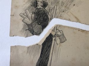 The Norman Lindsey drawing on board I am treating appears to have been torn in two pieces by brute force! I can’t help but wonder what happened to lead to that event.