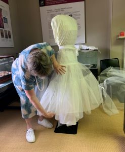 Once the garments were taken from the storage boxes and unwrapped from the acid-free tissue paper, various measurements were taken of the garments, the height of the stand was adjusted and the mannequin was attached to the rod with cable ties. The wire mesh frames were first covered with protective layers of acid-free tissue paper and soft polyester wadding, then cotton material was stitched over the shoulders, then came jersey material fashioned to drape the mannequins, which had been skilfully made by Ruth Edwards, sister of the Friends of Grossmann House collection coordinator, Lynn Morris. All these layers are required, not only to protect the garments from the wire mesh frames, but also to soften the look. The draped material is cinched at the waist with cotton tape for shaping.