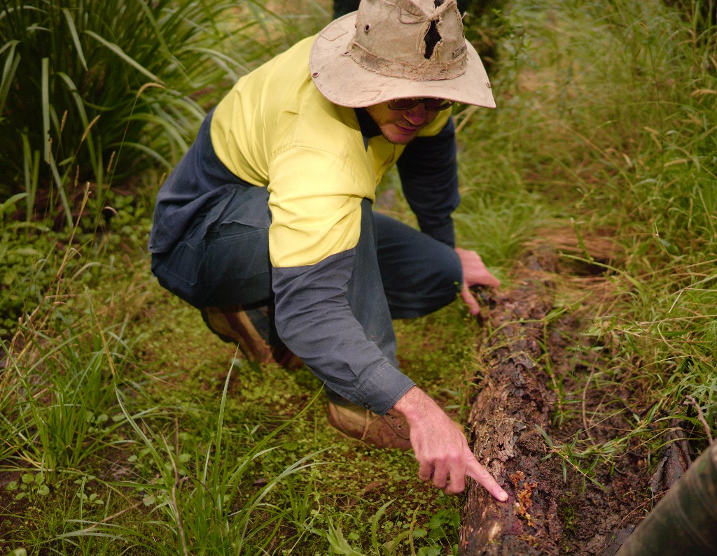 After removing the Blackberry, Adrian’s team found the soil was in desperate need of regeneration. Building the ecosystem from the ground up was critical to successfully regenerating the site, so they tried an experimental method of digging fallen logs into the soil, which encourages worms and termites into the soil, as well as fungi to retain moisture.