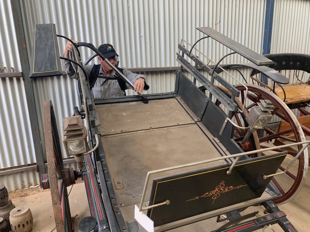 Recently, our Chiltern Properties Coordinator Vaughn Clarke together with Collections Managers Katie Potter and Michelle Derrick, commenced the start of an extensive program of preventative conservation to carefully remove dirt, dust, and debris from each vehicle before condition reporting to document any damage or deterioration. As part of this program, we sought specialist advice from The Sovereign Hill Museums Association Wheelwrights and Blacksmith Manager, Mick Dando. Mick provided us with invaluable guidance and support for safely relocating, storing, and conserving the vehicles. As part of this supportive collaboration, Mick and his team also supplied us with specially made wheel chocks for the vehicles to hold them securely in place while in storage.
