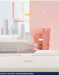 However, the National Trust objects to the temporary and permanent demolition of the Franklin Street Stores canopy to facilitate the encroachment and cantilever of the T1 and T2 tower developments behind the Stores.