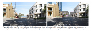 The scale of the proposed development does not respect the values and character of the adjacent State Heritage Register listed Millers Point Conservation Area. The bulk of the proposed buildings dominate the urban character along southern High Street, and will both physically and metaphorically overshadow these historic houses. Where initial view corridors along Barangaroo were designed to be generous and proportionate, the proposed increase in floor space and building heights impoverish these historic vistas.