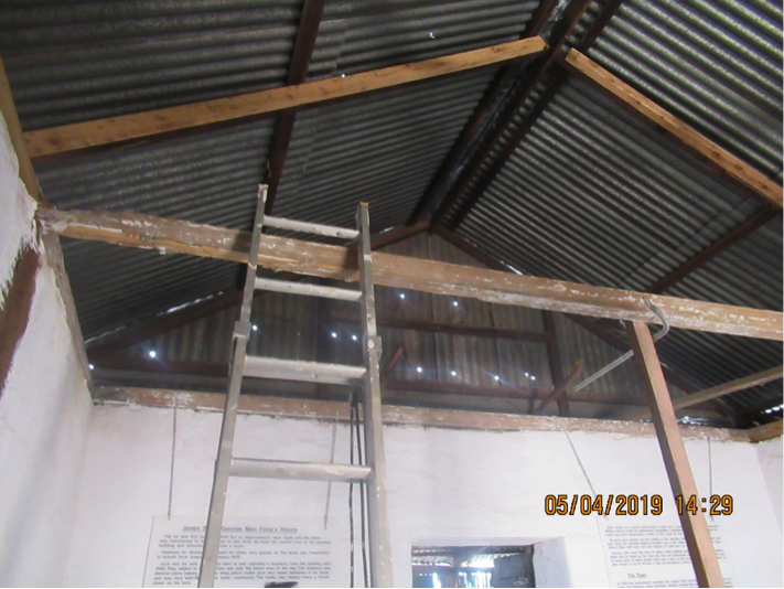 Two of the broken A-frame rafters were plated with 75mm x 50mm Cypress pine scantling with a missing brace replaced on the front end wall roof A-frame.