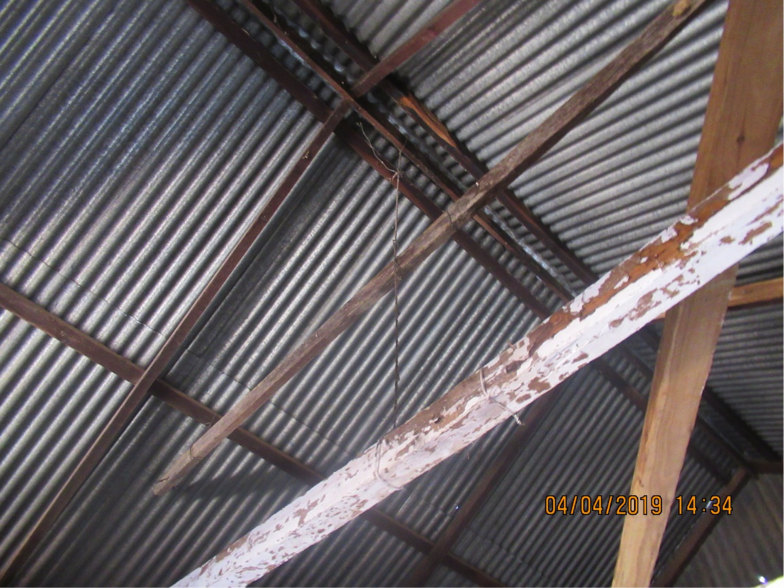 The wall of the original store building is topped by a 100mm x 100mm beam with two rafters at intervals across the room to support the ceiling. This is in extremely poor condition due to termite damage with twisting, warping of timbers all contributing to the beams becoming unattached and moving independently. The beams have been reattached using gang nail plates to move attachment points away from the more fragile ends of the beams and spacers. It will be necessary to add a central brace across the room to stabilise and strengthen the cross rafters which are sagging and no longer capable of load bearing.
