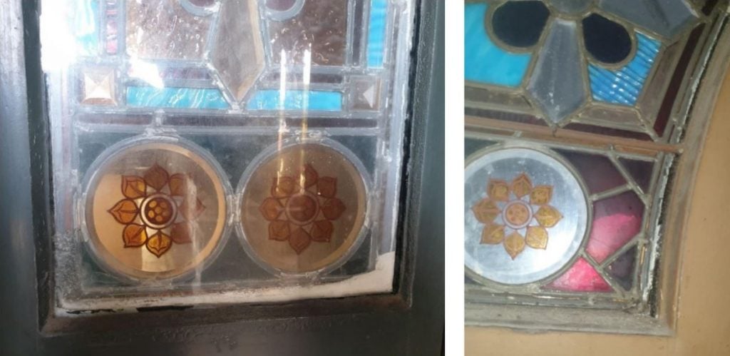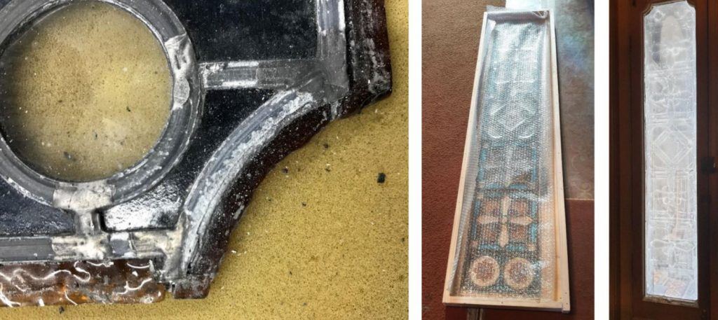 Powder at the base of these windows had being noted, suspected to be lead oxide caused by a break-down of the lead. Plate glass had being fitted as a protective system previously and it was suspected that this was contributing to a build-up of moisture. Stained Glass artist and conservator Bruce Hutton of Almond Glassworks was brought in to assess the sidelights and see what work was needed to conserve them. Bruce states that “there is much debate about the double glazing of leadlight, principally, whether it needs to be ventilated to prevent condensation. The detrimental presence of moisture in such an environment has been well documented for medieval glass, however the effect upon glass produced post 1850 is not so studied”.