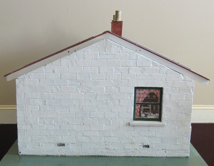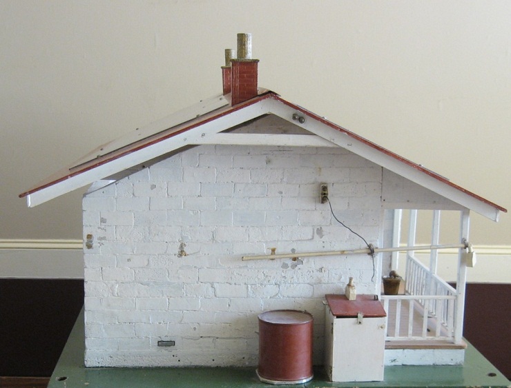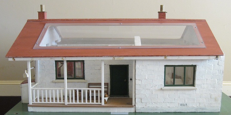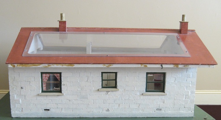 The roof of the model has two areas cut away and covered in perspex to allow the interior to be seen. Each room is fully furnished with curtains, carpet, chairs, tables and so forth. miniature items such as cooking pots and pans as well as paintings and ornaments are present too.