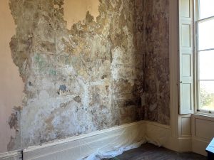 Work at Clarendon has addressed problems of rising, falling and penetrating damp. This has included replacing rainwater goods, tracing drainage lines, replacing the moat pump, and subtracting plastic sheeting underlying the basement paving that forced moisture into the walls of the house.