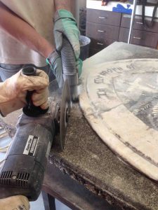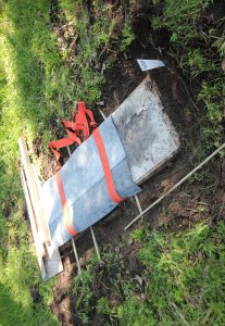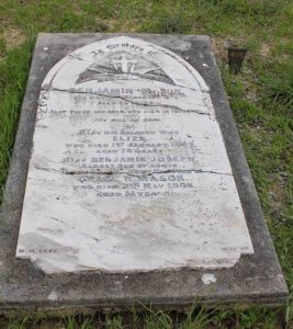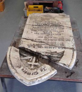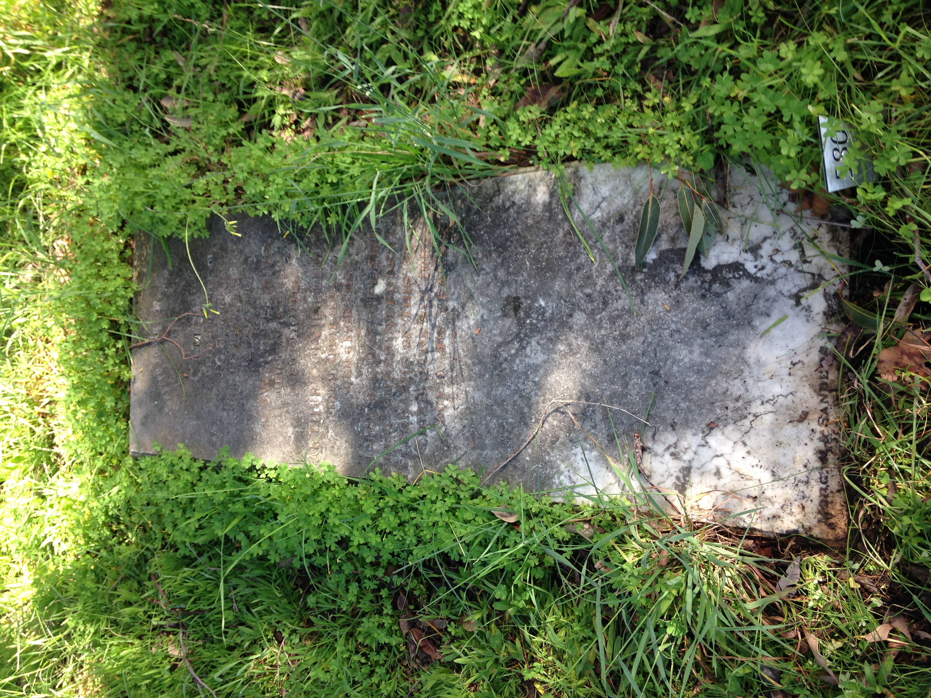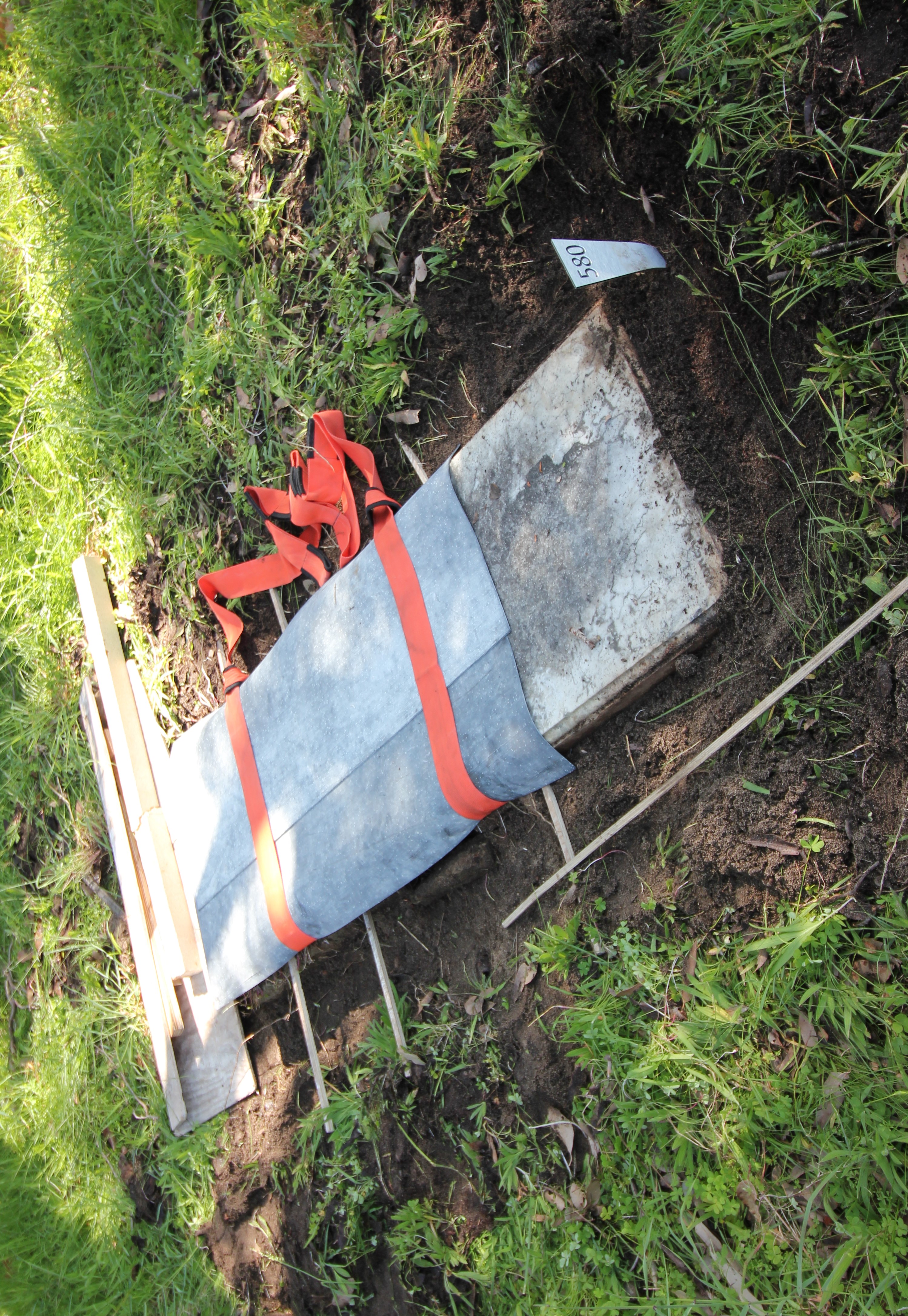 Concrete slab was removed, the marble headstone was cleaned and broken pieces repaired with fibreglass pins and epoxy resin, lead lettering conserved and headstone was reset in upright position as per original.
