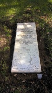 The headstone was cleaned to remove lichen formation and dirt, lead lettering was conserved and a new concrete slab was installed under the headstone to protect the marble sitting directly on the ground.