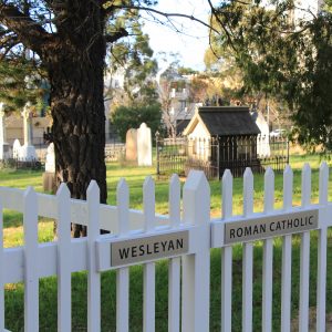Recently small sections of interpretive fencing have been installed to assist with wayfinding and to signify the original cemetery subdivisions. While they don’t fully enclose each cemetery they provide a reminder of the subdivision and enclosure that was previously associated with the place. The design has been based on historical photographs that show the fencing associated with the Church of England and Jewish cemeteries. No evidence has yet been found for the fence design associated with the other cemeteries.