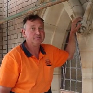 Ron Lodewijks, of Stone Restorations Rylstone, embodies all the key attributes of an outstanding heritage stonemason and builder. Ron is not only passionate about the restoration of heritage buildings, but also about the continuation of the craft of stone-masonry through the training and development of the next generation, who will continue this work into the future. Ron migrated to Australia in 1962 from Holland, with his mother being Dutch and his father Dutch-Indonesian. He grew up in Sydney and, after finishing high school, was employed as an apprentice stonemason. He completed his apprenticeship with Gosford Quarries, working on many of the finest heritage buildings in Sydney including the Queen Victoria Building, Central Railway Station, Lands Department and Education Department buildings and St Andrews Cathedral, to name a few. For the last six years Ron has been restoring the Catholic Cathedral of St Michael and St John, Bathurst, designed by Edward Gel and built in 1865.
