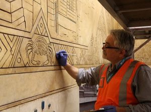 A fire at Central Station was the impetus for conservation restoration of this marvellous mid-century Melocco Brothers artwork. Now open to the public, the impressive wrap-around wall relief depicts the history of transportation above travertine walling and a beautiful terrazzo floor map of Australia.