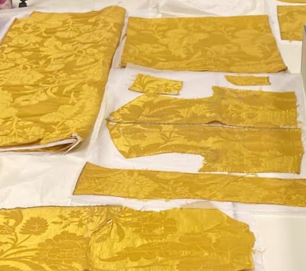 Believed to have been donated to the National Trust in the 1970s, the pieces of exquisite yellow silk damask were discovered in a storage bag at Old Government House. The fragments were oddly shaped, with some sewn into a belt and child-sized bodice. While the luxuriousness of the fabric suggested it was from the 18th century, very little was known about its history.