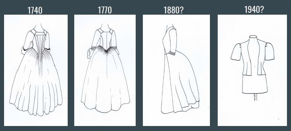 The biggest riddles were the triangular-shaped pieces that looked like stomachers – a panel that fills in the front opening of a gown. “The pieces were too long to be stomachers,” explained Lucy. “We began to think it could be a back piece instead, so we pinned them onto a mannequin and ended up making our biggest breakthrough – it turned out there was more than one back to this dress.”