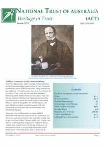 Heritage in Trust March 2021Publication ACTRead about the first Europeans on the Limestone Plains, reports on our varied walks and talks, what’s planned for the Kingston Arts Precinct and more…Click on the cover below to read the full edition.
