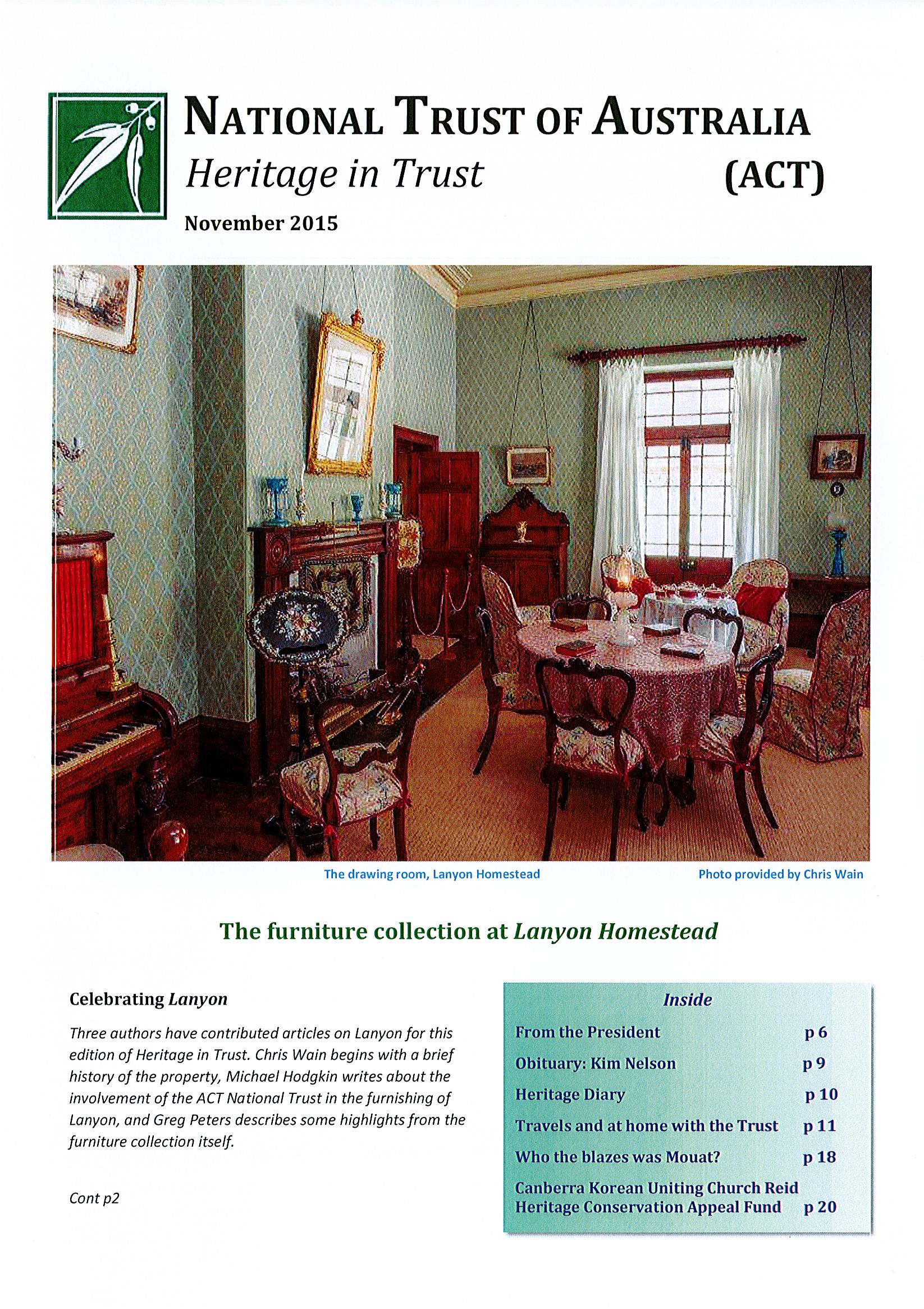 Heritage in Trust November 2015Publication ACTInside this issue: Who the blazes was Mouat? Travels and at home with the Trust, Canberra Korean Uniting Church Reid Heritage Conservation Appeal Fund & Obituary: Kim Nelson.